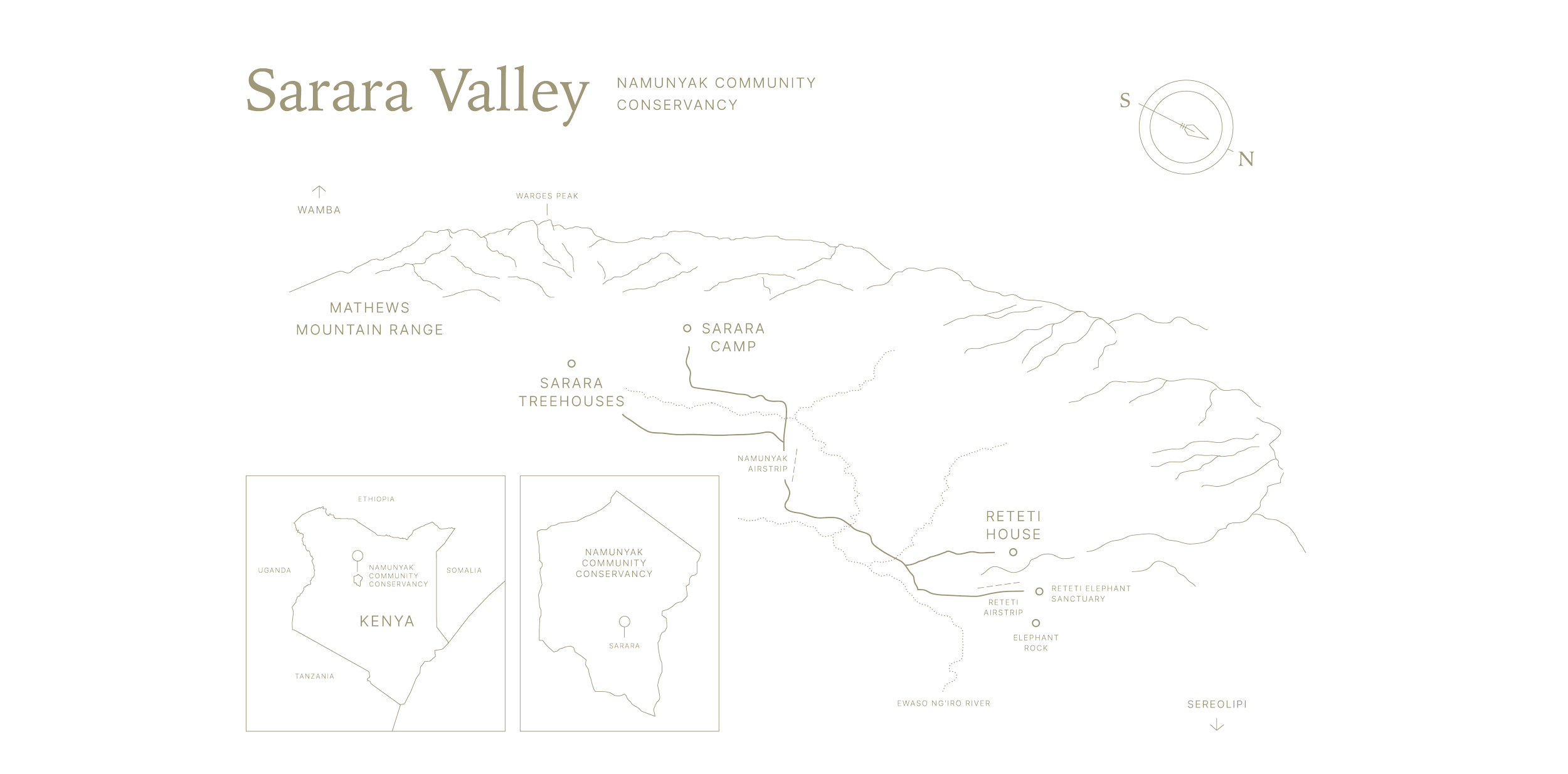 Sarara Wilderness, situated in the wider Samburu ecosystem, is within reach of both Kalama and Buffalo Springs airstrips. Guests can opt for scheduled flights with Safarilink or Air Kenya – or make use of private charters. Travel time from Sarara Camp, Reteti House, and Sarara Treehouses is 2.5 hours.