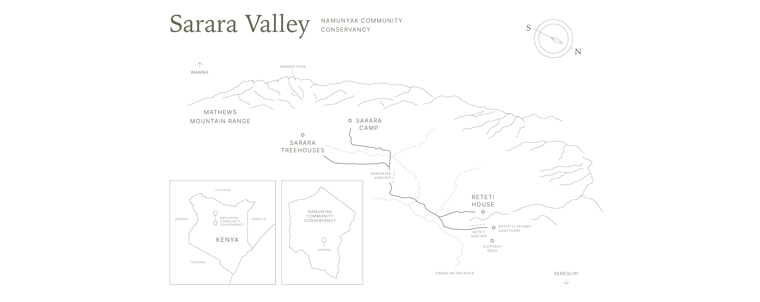 Sarara Wilderness, situated in the wider Samburu ecosystem, is within reach of both Kalama and Buffalo Springs airstrips. Guests can opt for scheduled flights with Safarilink or Air Kenya – or make use of private charters. Travel time from Sarara Camp, Reteti House, and Sarara Treehouses is 2.5 hours.